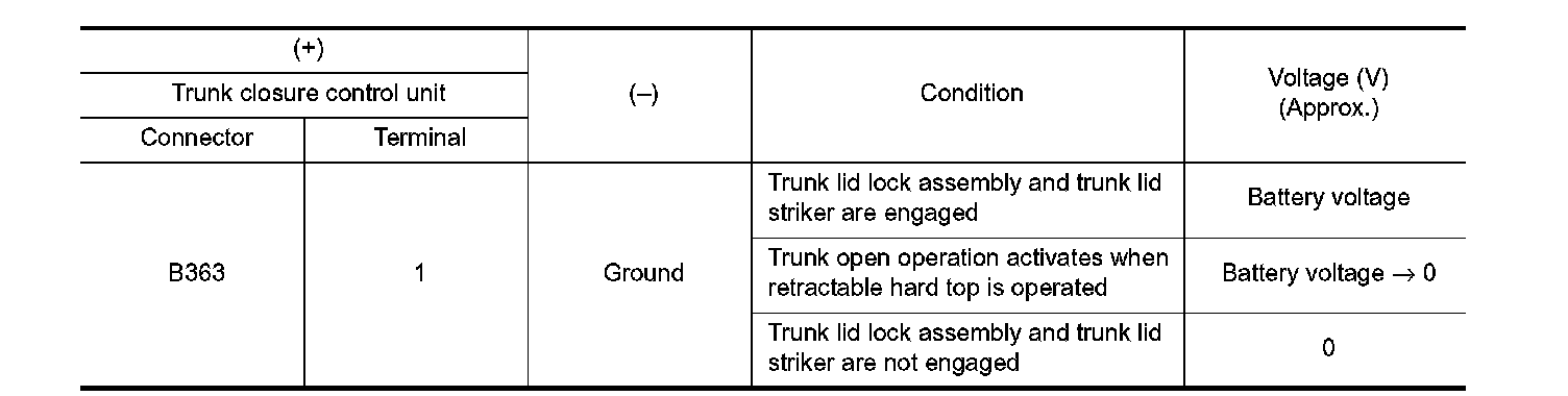3. Check voltage between trunk closure control unit harness connector and ground.