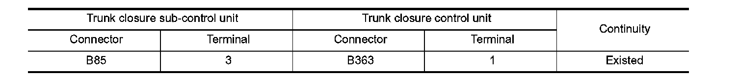 2. Check continuity between trunk closure sub-control unit harness connector and trunk closure control unit harness connector.