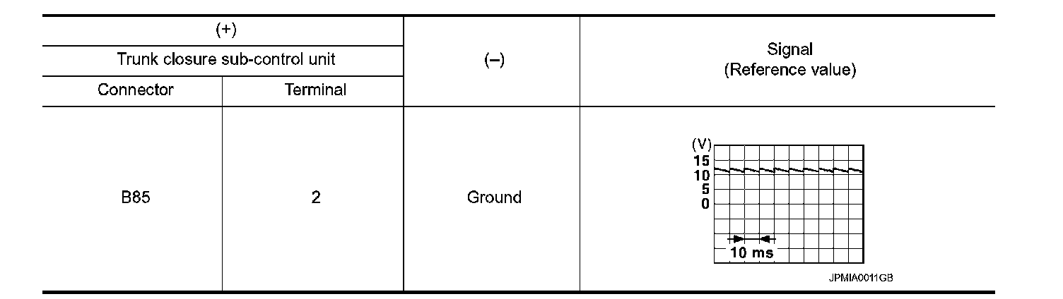 Check signal between trunk closure sub-control unit harness connector and ground using oscilloscope.