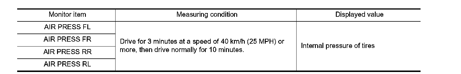 Stop the vehicle and within 5 minutes, use CONSULT-III "DATA MONITOR" to display the tire pressure for all wheels.