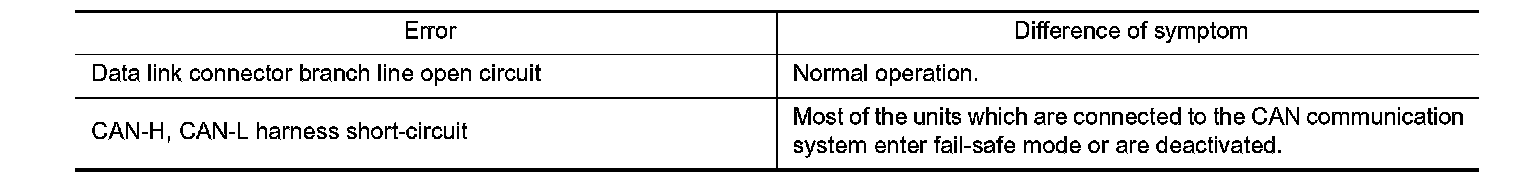 - When data link connector branch line is open, transmission and reception of CAN communication signals are not affected. Therefore, no symptoms occur. However, be sure to repair malfunctioning circuit.