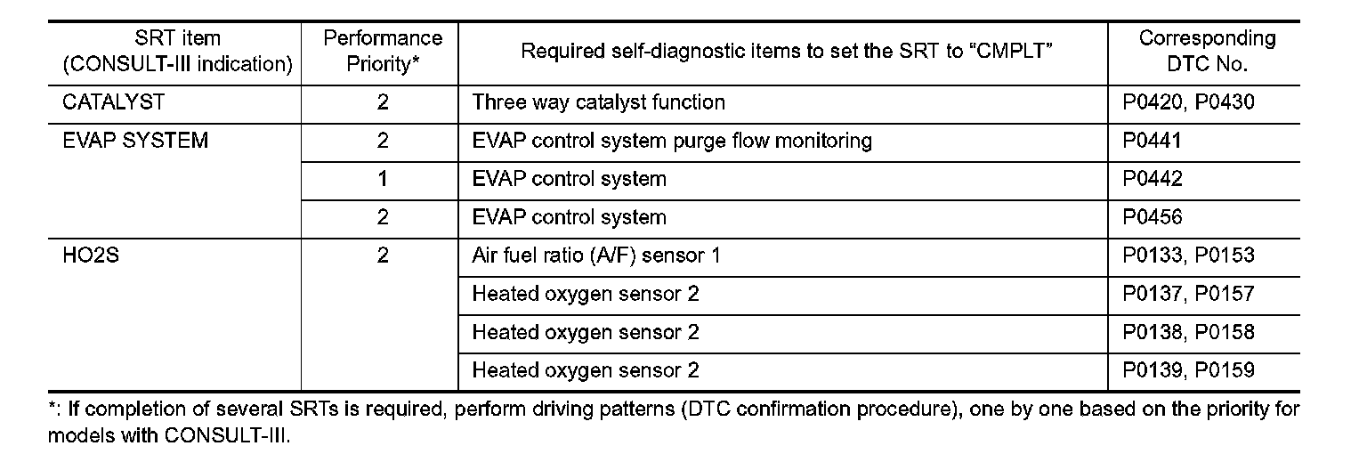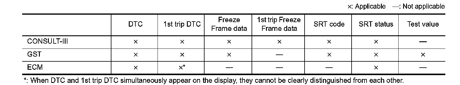 For malfunctions in which 1st trip DTCs are displayed, refer to "EMISSION-RELATED DIAGNOSTIC INFORMATION ITEMS". These items are required by legal regulations to continuously monitor the system/component. In addition, the items monitored non-continuously are also displayed on CONSULT-III.