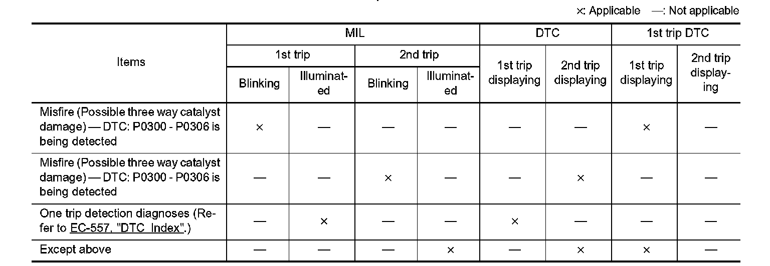 The "trip" in the "Two Trip Detection Logic" means a driving mode in which self-diagnosis is performed during vehicle operation. Specific on board diagnostic items will cause the ECM to illuminate or blink the MIL, and store DTC and Freeze Frame data, even in the 1st trip, as shown below.