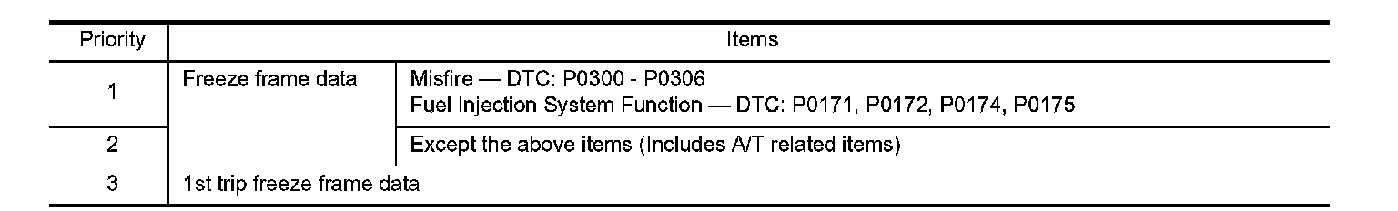 For example, the EGR malfunction (Priority: 2) was detected and the freeze frame data was saved in the 2nd trip. After that when the misfire (Priority: 1) is detected in another trip, the freeze frame data will be updated from the EGR malfunction to the misfire. The 1st trip freeze frame data is updated each time a different malfunction is detected. There is no priority for 1st trip freeze frame data. However, once freeze frame data is stored in the ECM memory, 1st trip freeze data is no longer stored (because only one freeze frame data or 1st trip freeze frame data can be stored in the ECM). If freeze frame data is stored in the ECM memory and freeze frame data with the same priority occurs later, the first (original) freeze frame data remains unchanged in the ECM memory.
