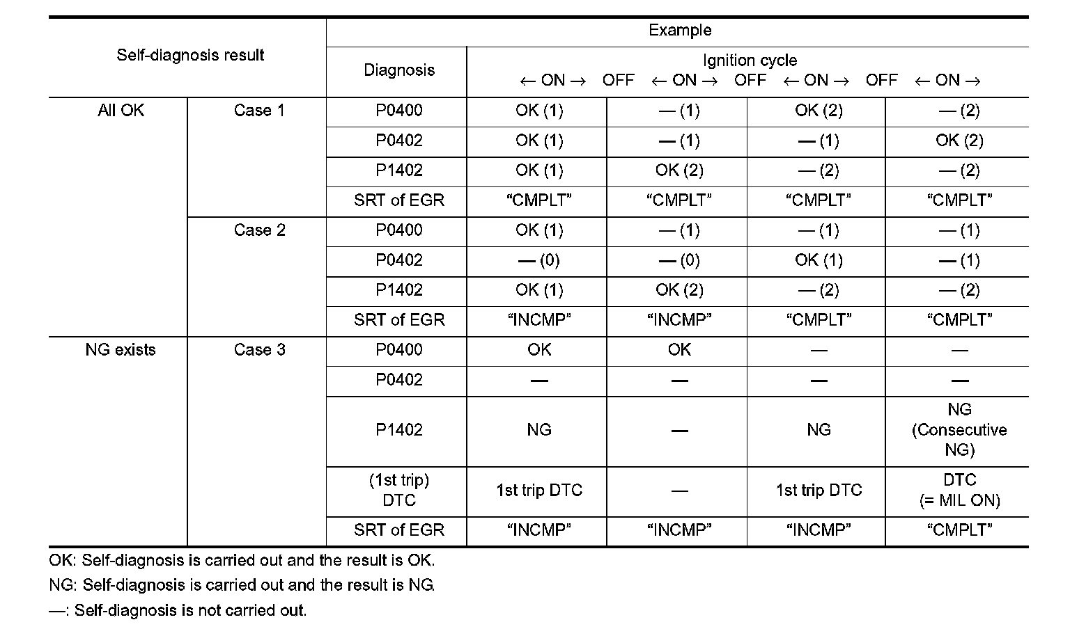 When all SRT related self-diagnoses show OK results in a single cycle (Ignition OFF-ON-OFF), the SRT will indicate "CMPLT". to Case 1 above