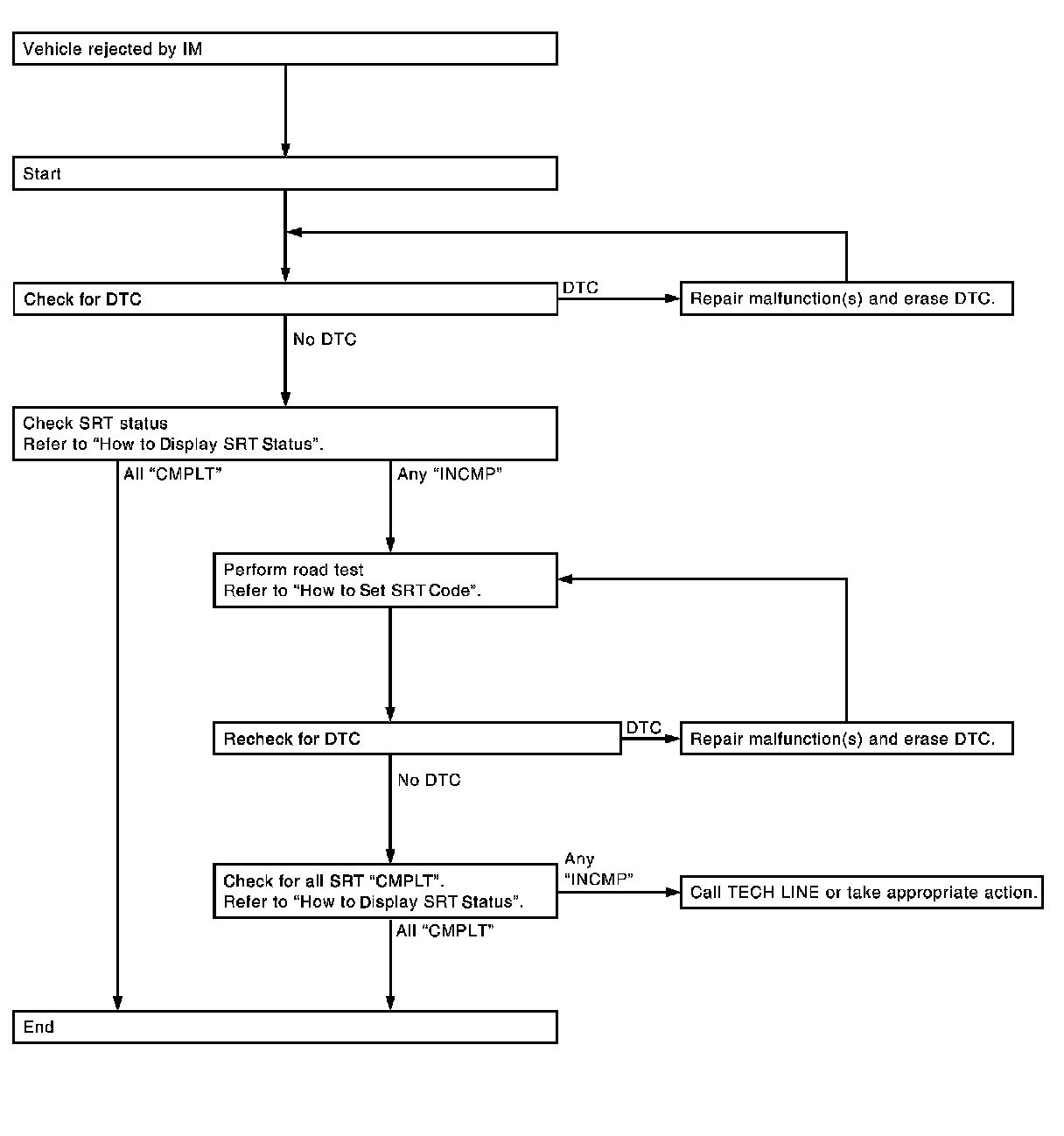 If, during the state emissions inspection, the SRT indicates "CMPLT" for all test items, the inspector will continue with the emissions test. However, if the SRT indicates "INCMP" for one or more of the SRT items the vehicle is returned to the customer untested.