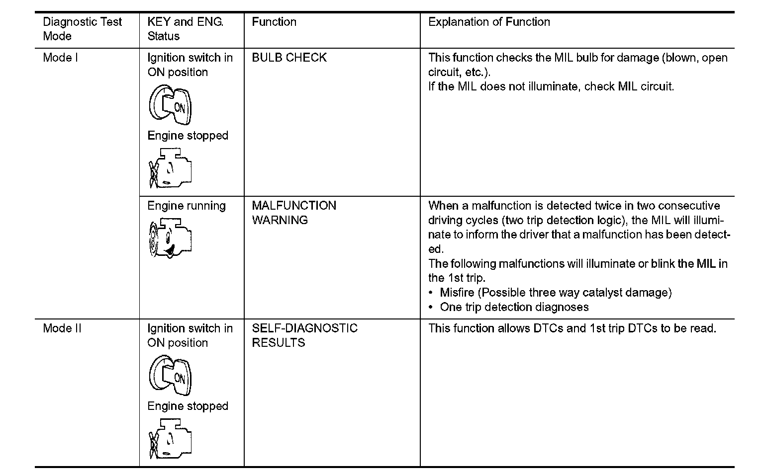 1. The MIL will illuminate when the ignition switch is turned ON without the engine running. This is a bulb check.