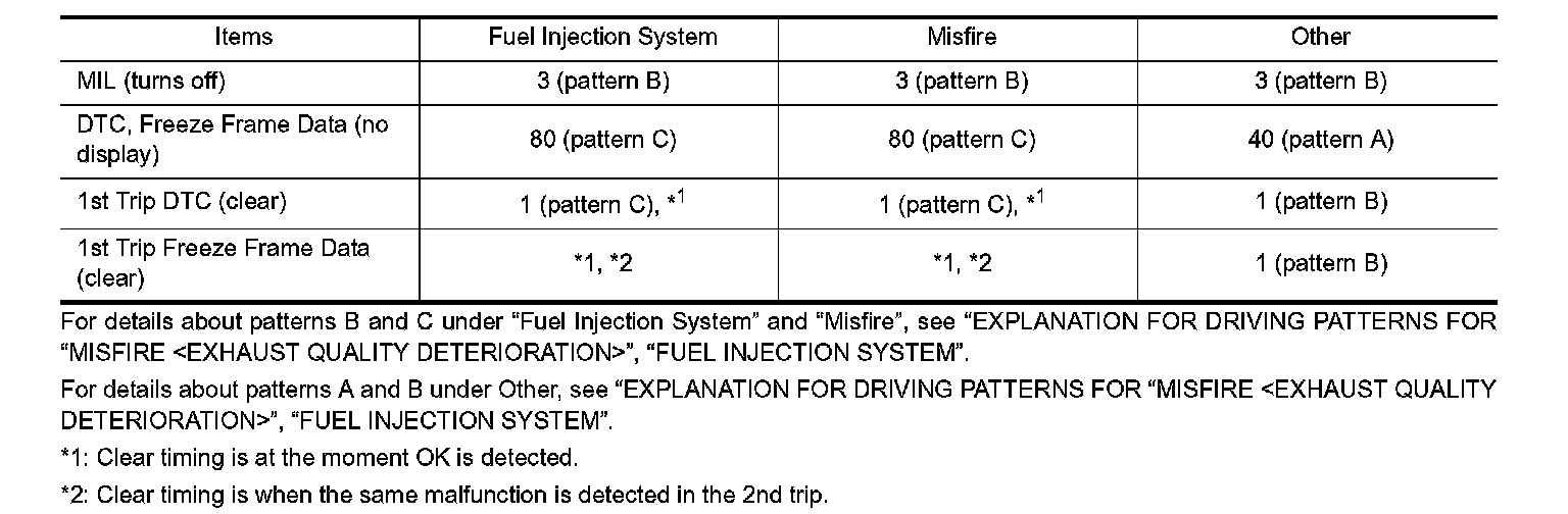 - The DTC and the freeze frame data will be stored until the vehicle is driven 40 times (driving pattern A) without the same malfunction recurring (except for Misfire and Fuel Injection System). For Misfire and Fuel Injection System, the DTC and freeze frame data will be stored until the vehicle is driven 80 times (driving pattern