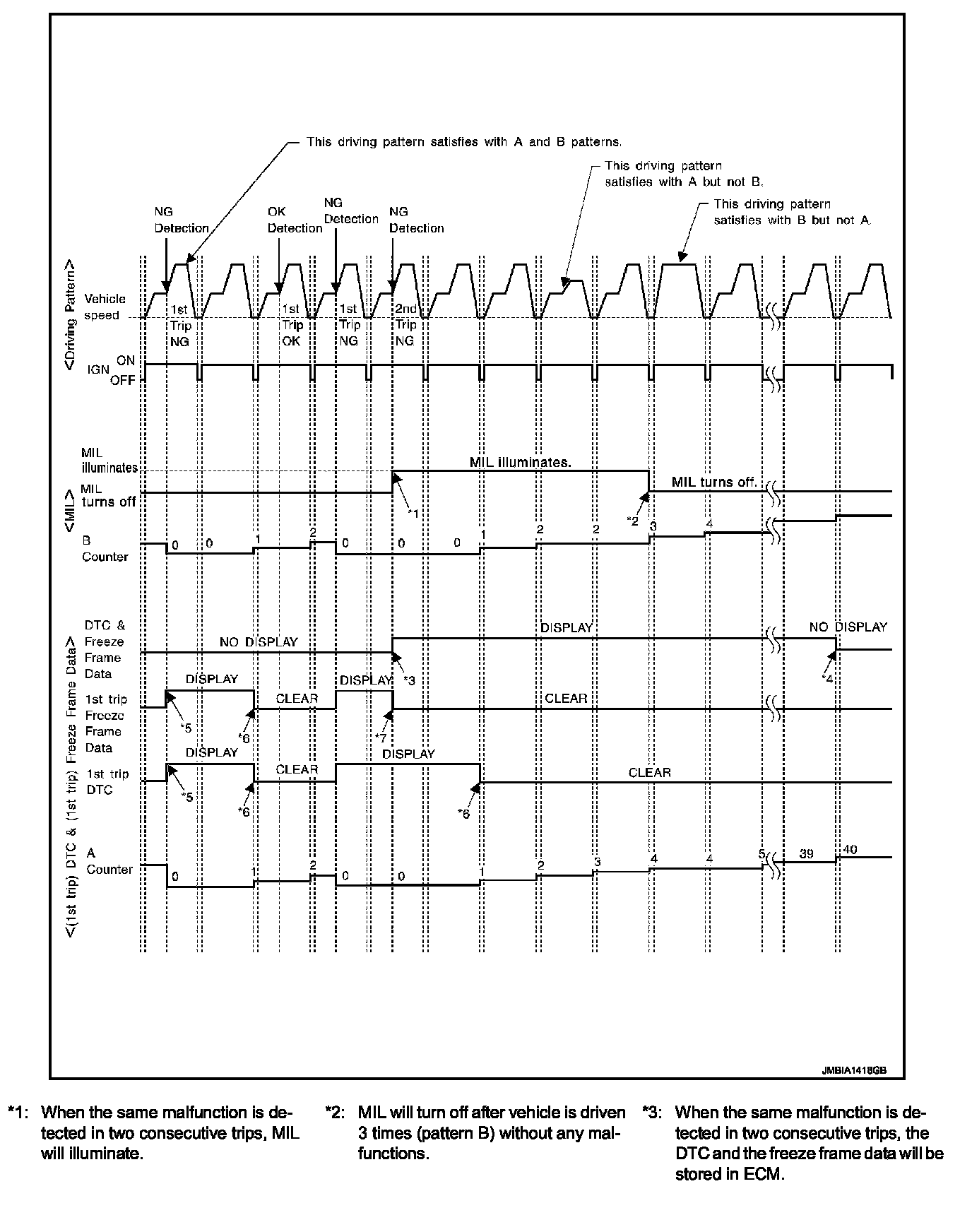- The MIL will turn off when the B counter reaches 3 (*2 in OBD SYSTEM OPERATION CHART).