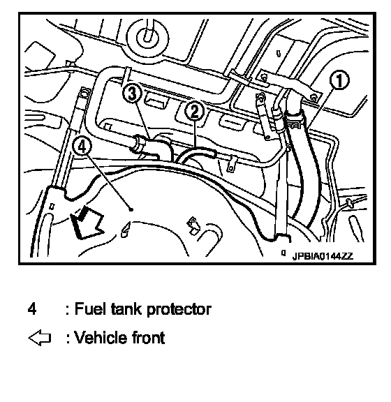 6. Disconnect fuel filler hose (1), vent hose (2), and EVAP hoses (3) at fuel tank side.