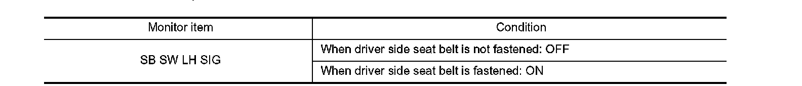 When checking "SB SW LH SIG" on DATA MONITOR screen, check that ON/OFF display changes synchronized with the insertion operation to the seat belt buckle.