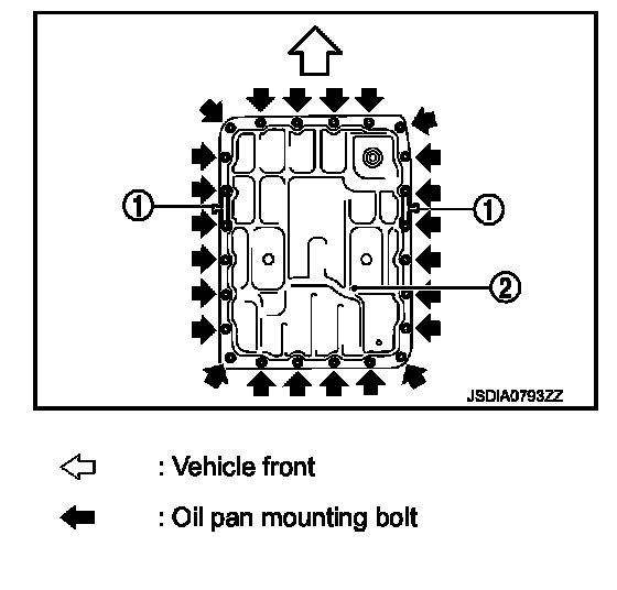 - Tighten the oil pan mounting bolts to the specified torque in the numerical order as shown in the figure after temporarily tightening them.
