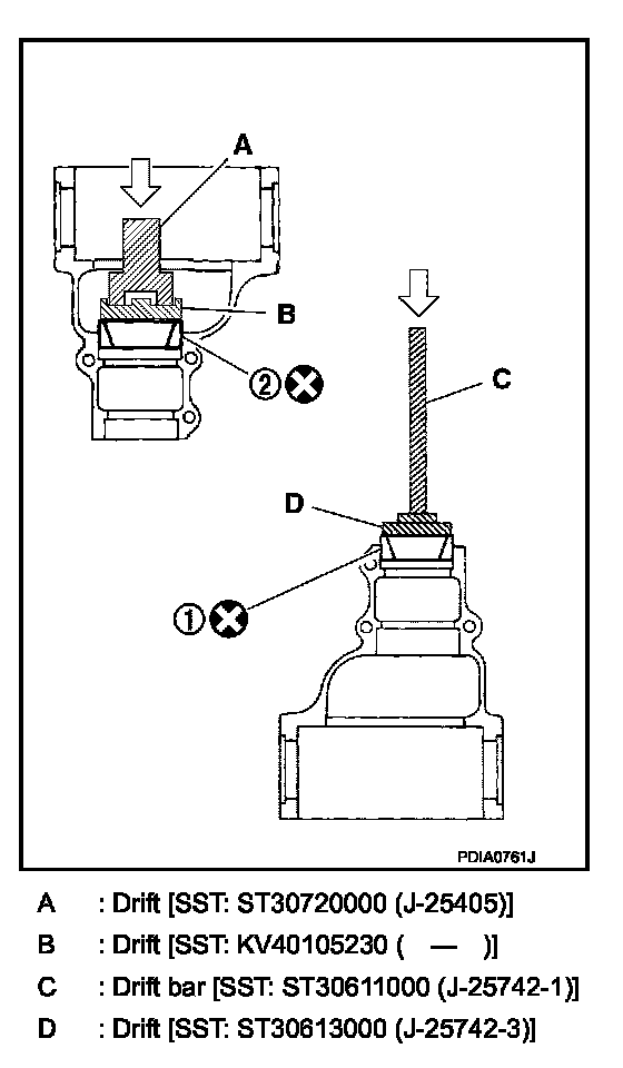 1. Install front bearing outer race (1) and rear bearing outer race (2) using drifts.