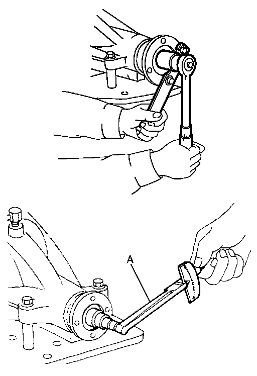 11. Adjust to the drive pinion lock nut tightening torque and pinion bearing preload torque, using preload gauge (A) [SST: