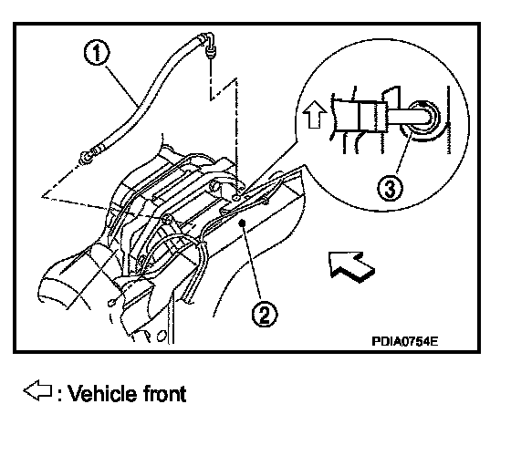 - For installation, insert the breather connector to suspension member (2). Install metal connector (3) to rear cover with aiming painted marking to the front of vehicle.