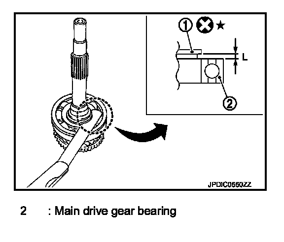 2. Select and install snap ring (1) to main drive gear so that the end play "L" is adjusted to the standard value.