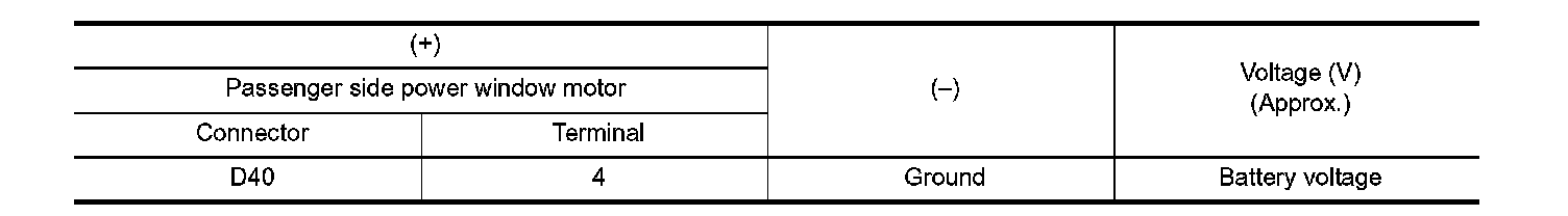 3. Check voltage between passenger side power window motor harness connector and ground.