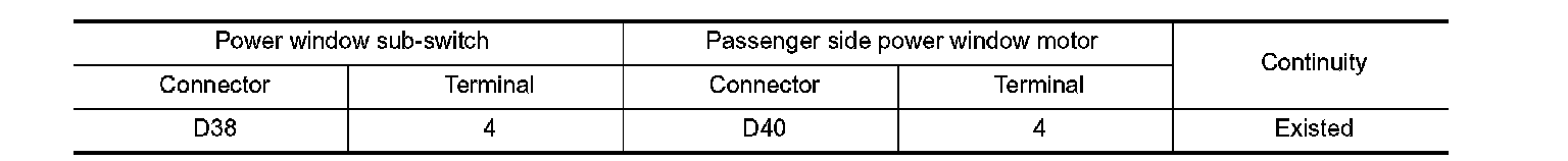 3. Check continuity between power window sub-switch harness connector and passenger side power window motor harness connector.