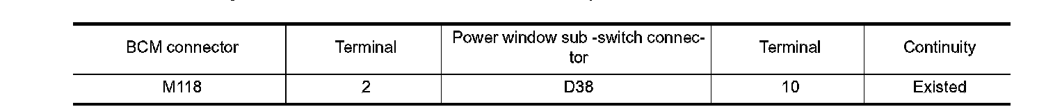 3. Check continuity between BCM harness connector and power window sub-switch harness connector.
