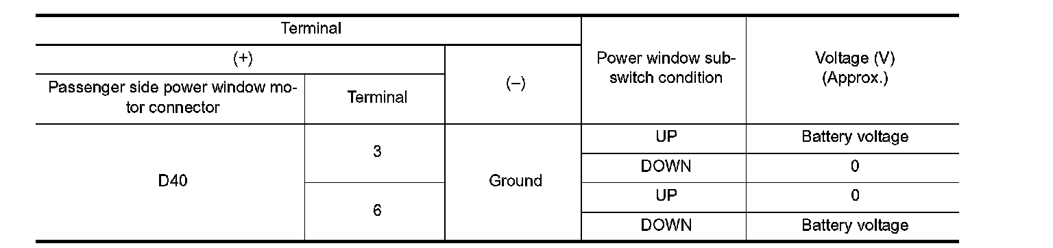 4. Check voltage between passenger side power window motor harness connector and ground.