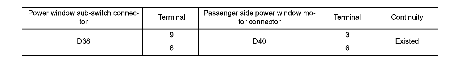 3. Check continuity between power window sub-switch harness connector and passenger side power window motor harness connector.