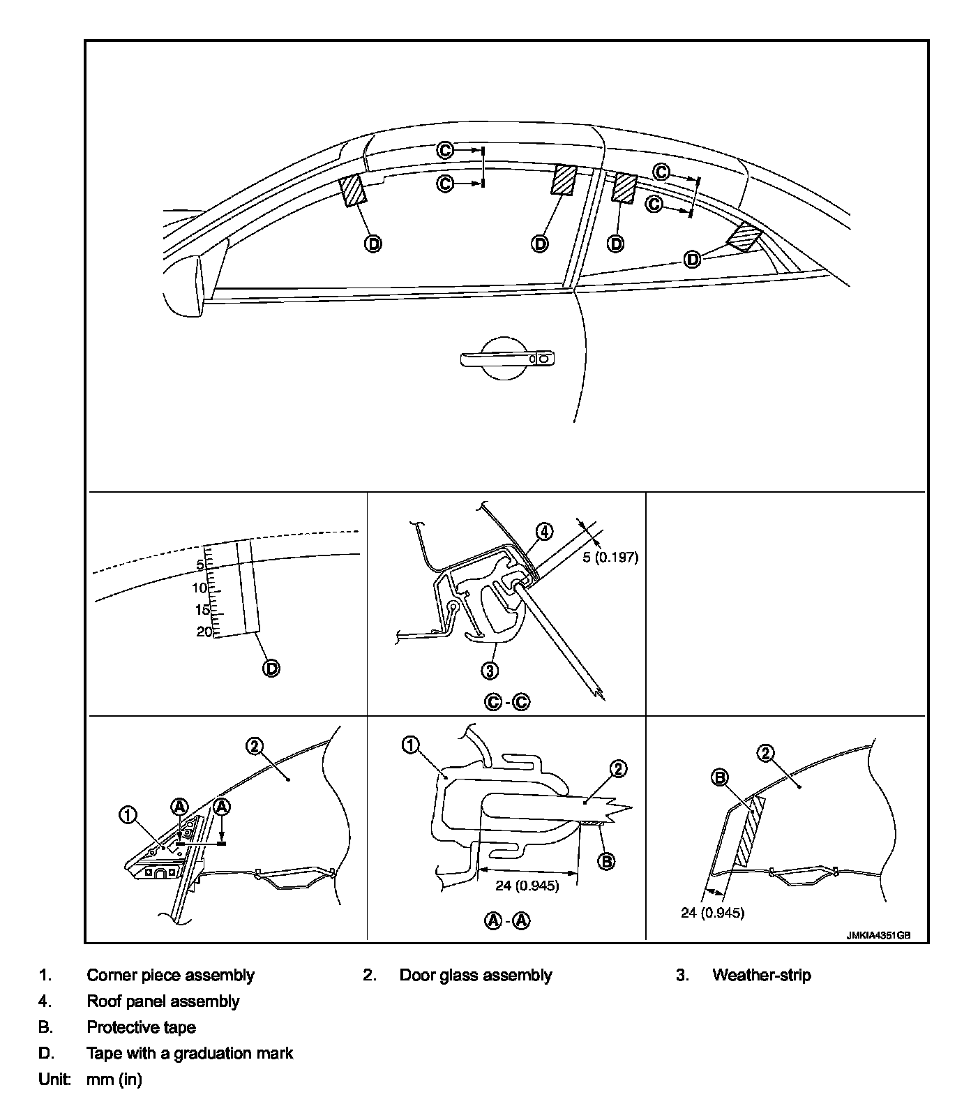 2. Apply protective tape (B) on door glass at a distance of 24 mm (0.945 in), starting from the door front edge as shown in the figure above.