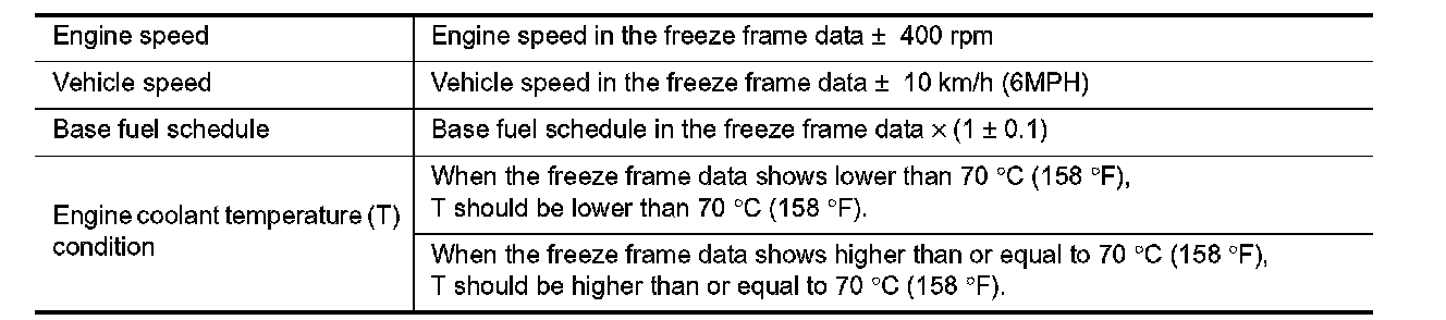 4. Start engine and drive the vehicle under similar conditions to (1st trip) Freeze Frame Data for a certain time. Refer to the table below.