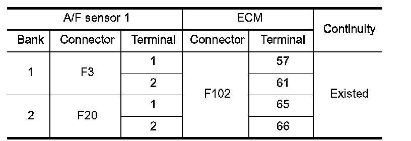 4. Check the continuity between A/F sensor 1 harness connector and ECM harness connector.