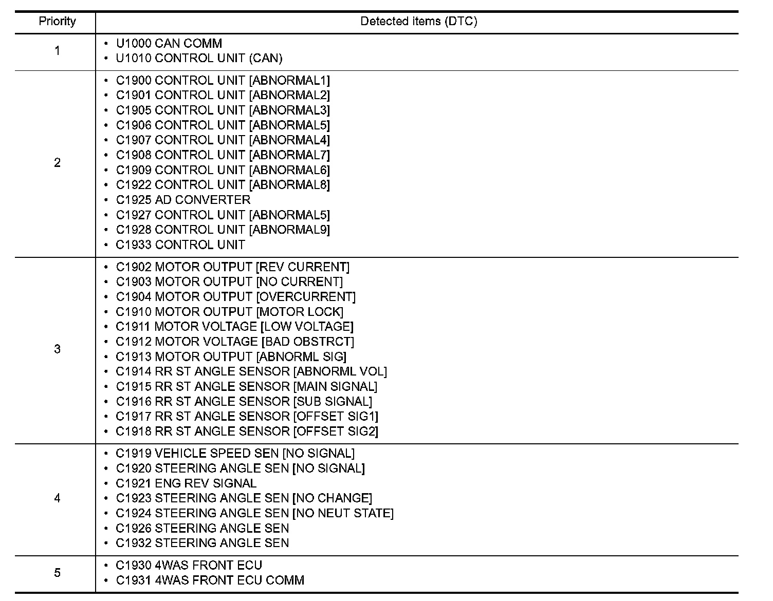 If some DTCs are displayed at the same time, perform inspections one by one based on the following priority chart.