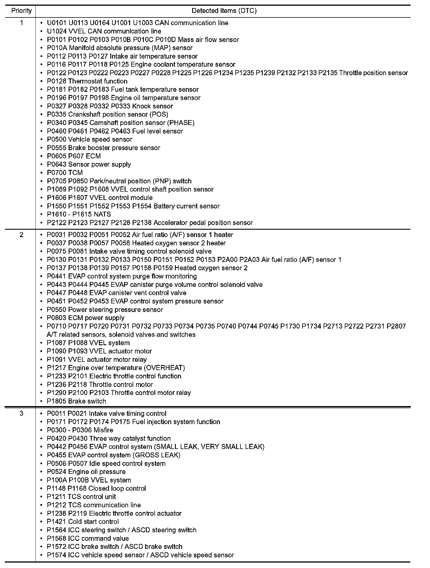 If some DTCs are displayed at the same time, perform inspections one by one based on the following priority chart.