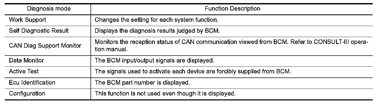 CONSULT-III performs the following functions via CAN communication with BCM.