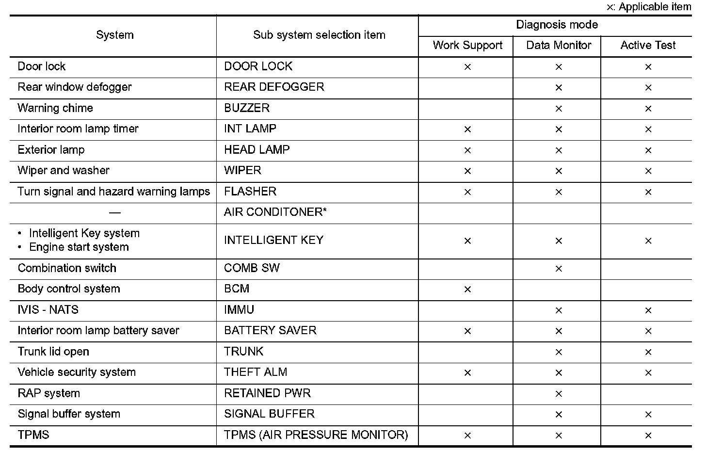 It can perform the diagnosis modes except the following for all sub system selection items.