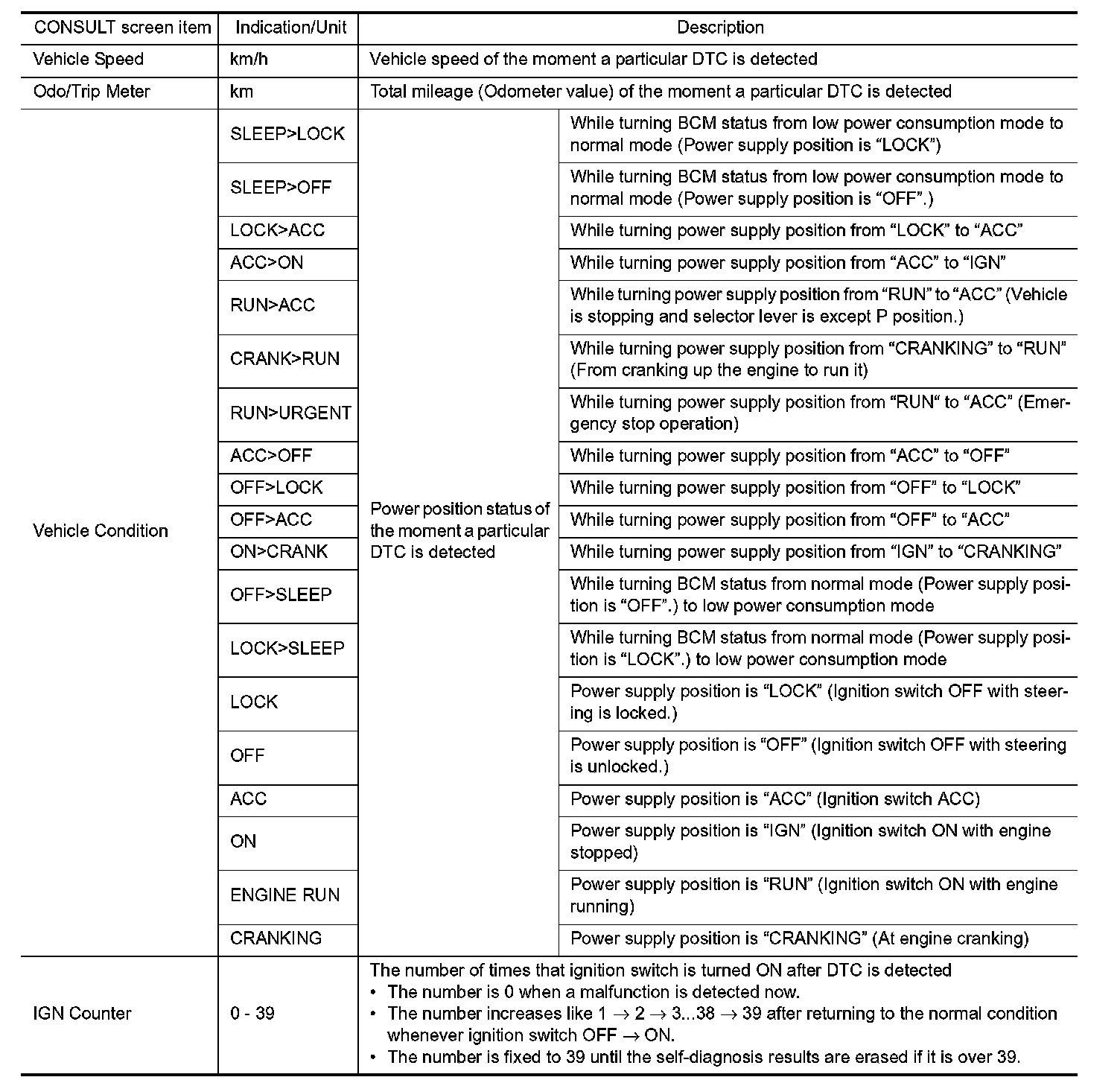 The BCM records the following vehicle condition at the time a particular DTC is detected, and displays on