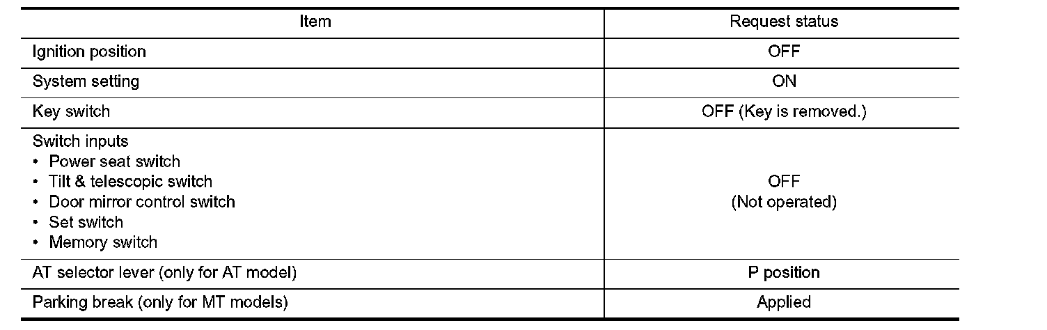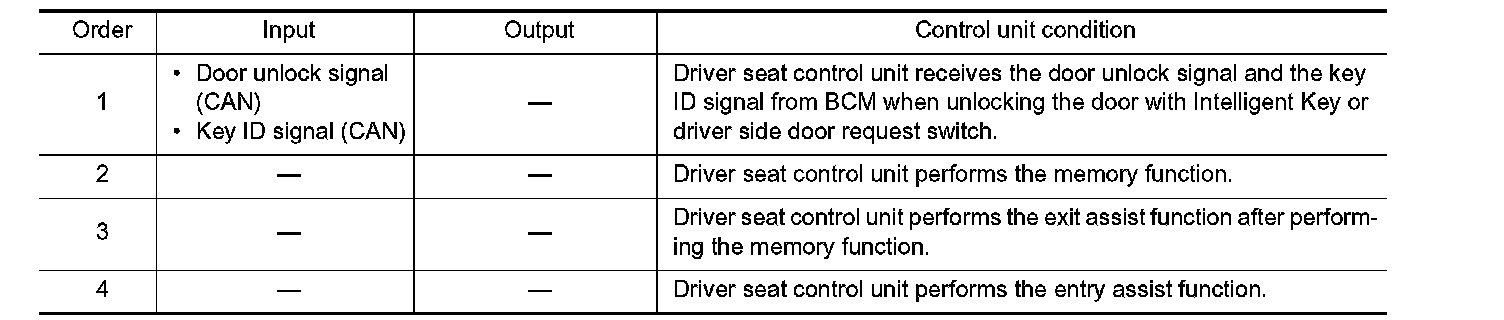 When unlocking doors by using Intelligent Key or driver side door request switch, the system performs memory operation, exiting operation then entry operation.