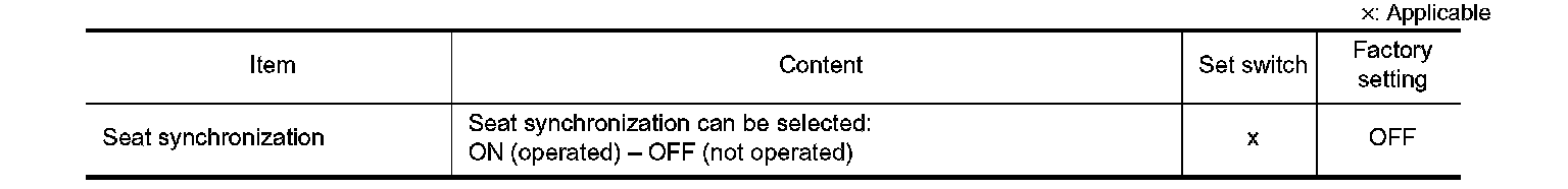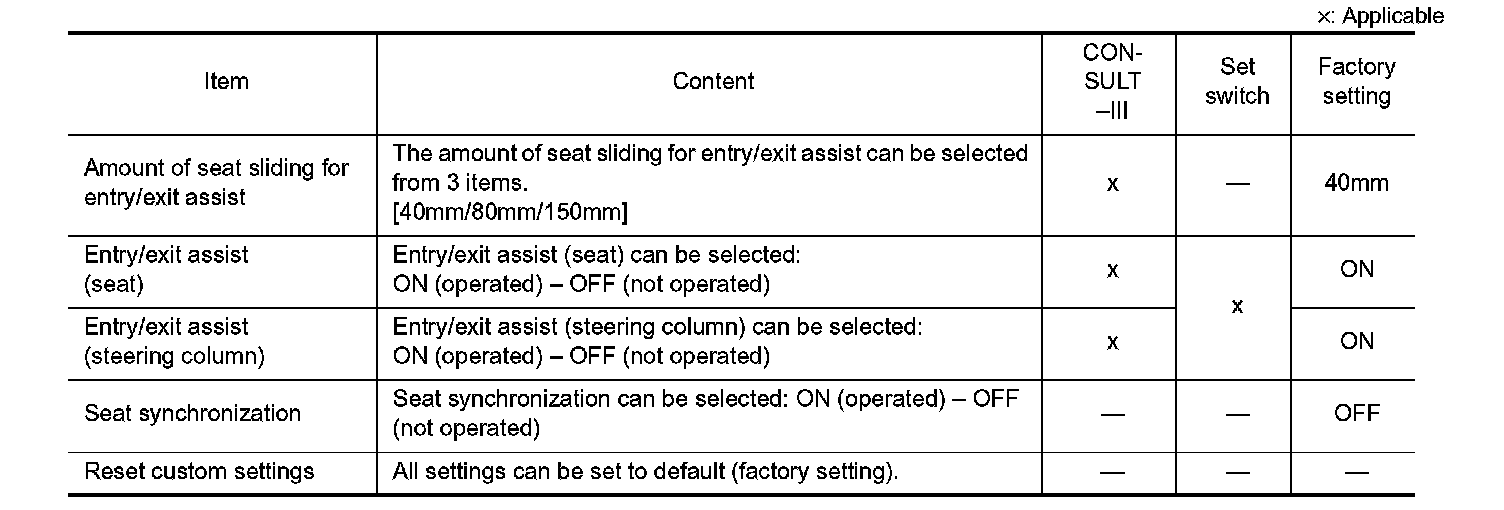 The settings of the automatic driving positioner system can be changed, using CONSULT-III, and the set switch. Always check the settings before and after disconnecting the battery terminal or replacing driver seat control unit.