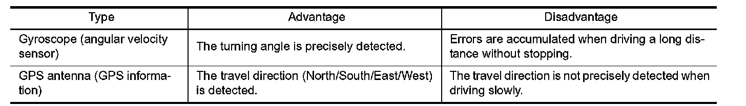 The gyroscope (angular velocity sensor) and GPS antenna (GPS information) generate the change of the travel direction. Both have advantages and disadvantages as per the following descriptions.