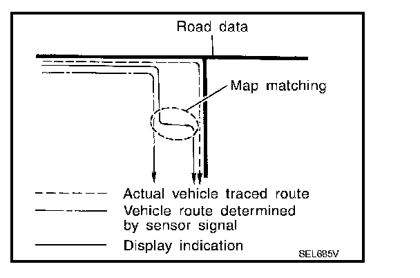 Map-matching repositions the vehicle on the road map when a new location is judged to be more accurate. This is done by comparing the current vehicle position (calculated by the normal position detection method) from the map data stored in the HDD (Hard Disk Drive).