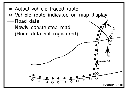 - Map-matching does not function correctly when road on which the vehicle is driving is new, etc. and not recorded in the map data.