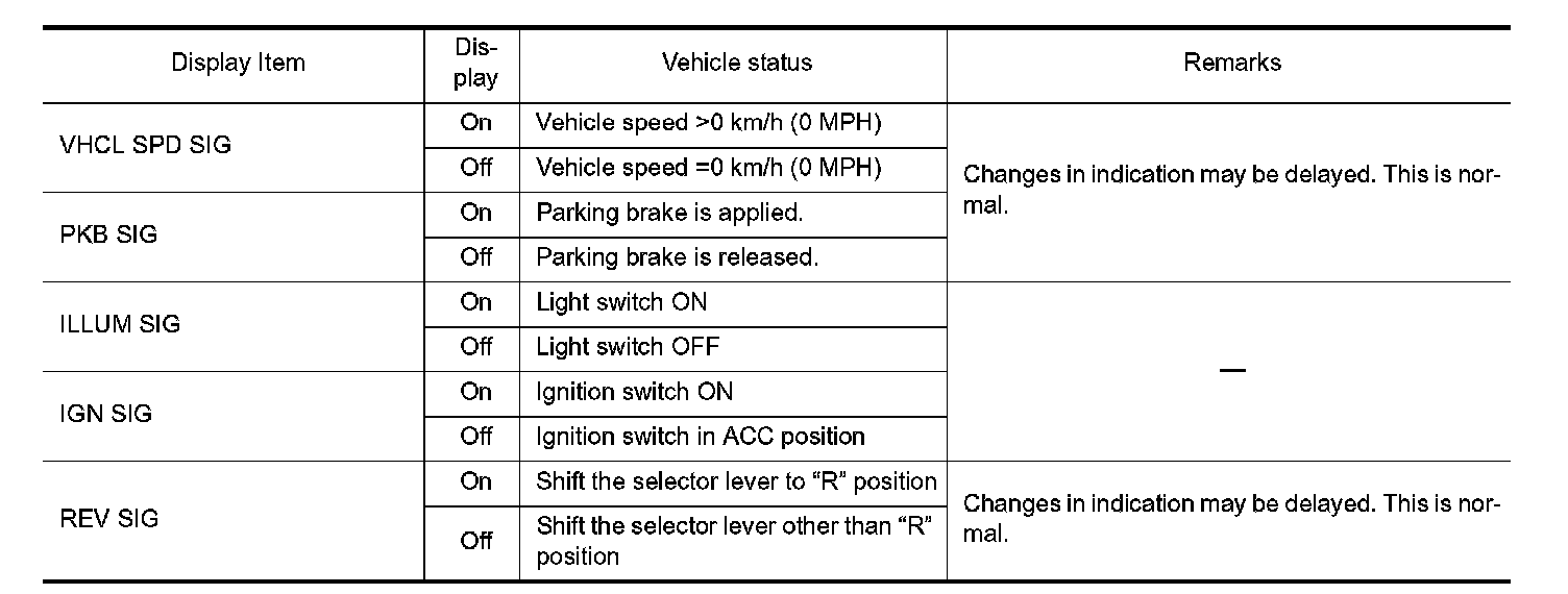- Displays the status of the following vehicle signals inputted into the AV control unit.