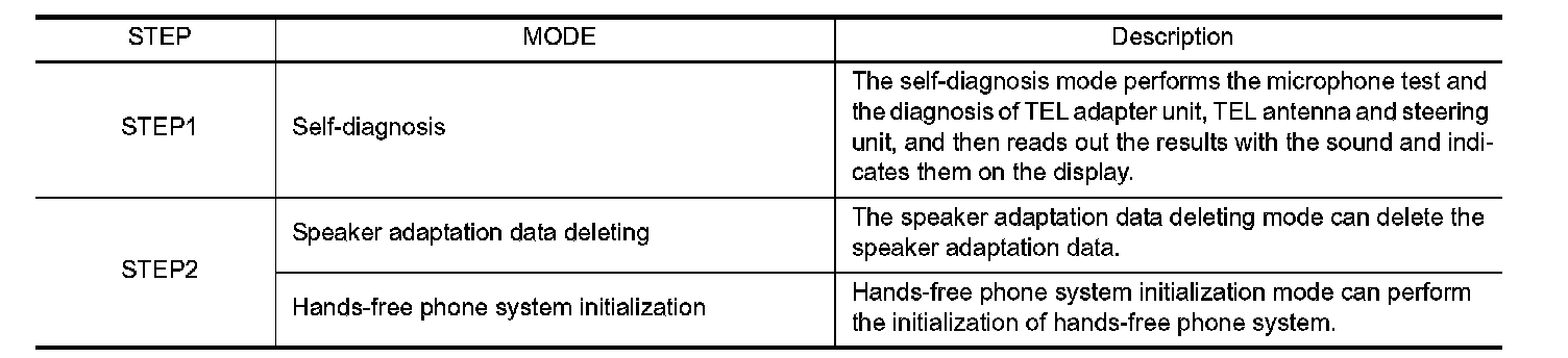 The on board diagnosis has 3 modes: the self-diagnosis mode that performs the trouble diagnosis, the speaker adaptation data deleting mode and the hands-free phone system initialization mode.
