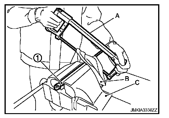 - When cutting a hole on trunk lid stay, always cover a hacksaw using a shop cloth (B) to avoid scattering metal fragments or oil.