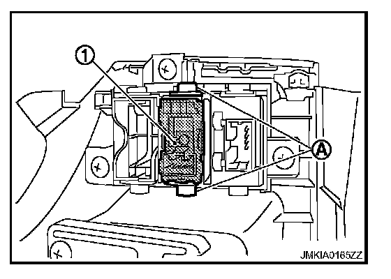 2. Remove the trunk lid opener switch (1) from instrument driver lower panel, and then remove pawl (A). Press trunk lid opener switch (1) front side to disengage from instrument driver lower panel.