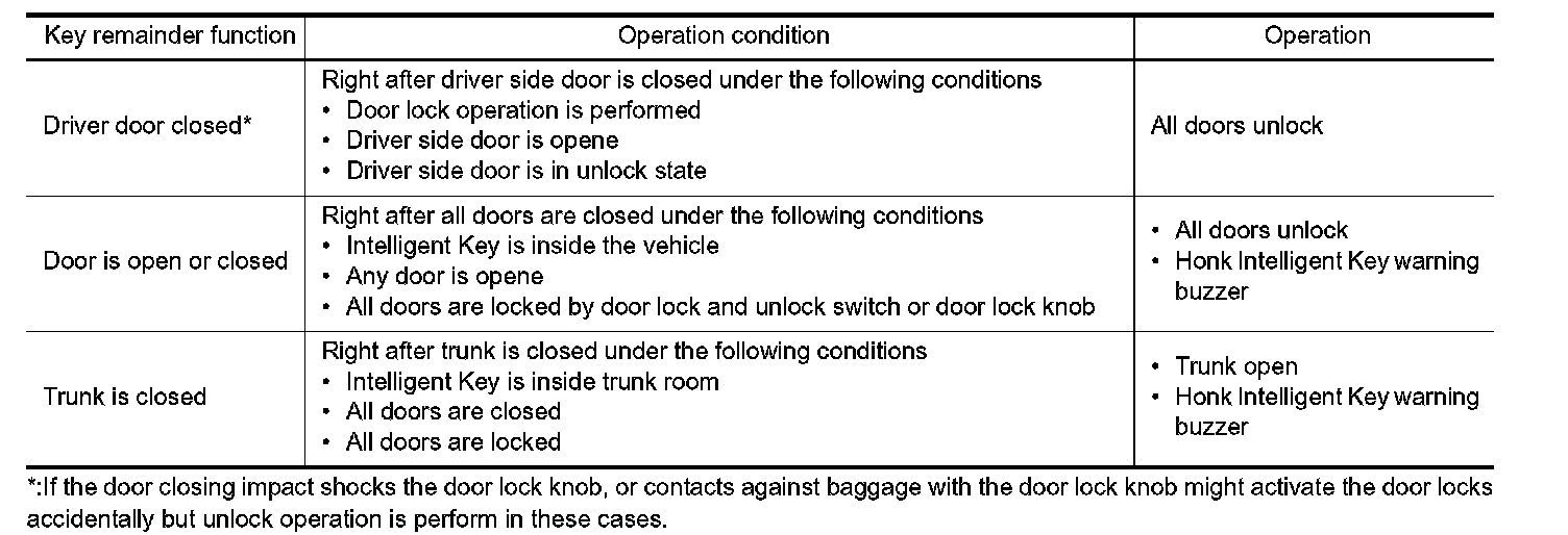 - The above function operates when the Intelligent Key is inside the vehicle. However, there may be times when the Intelligent Key cannot be detected, and this function does operate when the Intelligent Key is on the instrument panel, rear parcel shelf, or in the glove box. Also, this system sometimes does not operate if the Intelligent Key is in the door pocket for the open door.