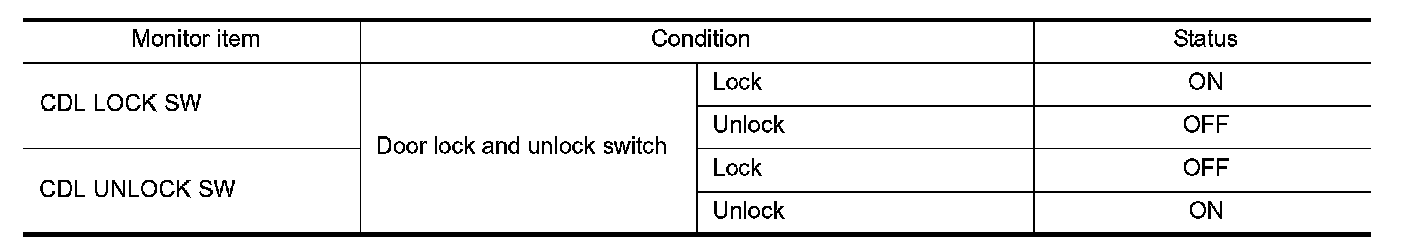 Check ("CDL LOCK SW ", "CDL UNLOCK SW") in "Data Monitor" mode with CONSULT-III.