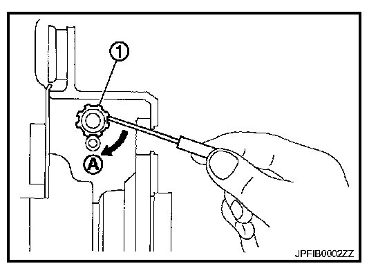 3. Remove the adjusting hole plug from the disc rotor. Turn the adjuster (1) in the direction (A) as shown in the figure using a suitable tool until the disc rotor is locked.