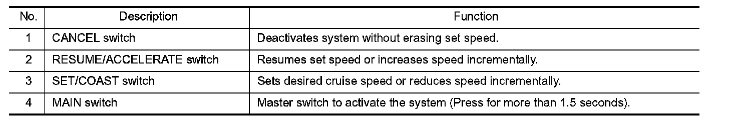 If the system is cancelled by conditions 1-7 below, the system will resume control at the last set cruising speed by pushing the RESUME/ACCELERATE switch.