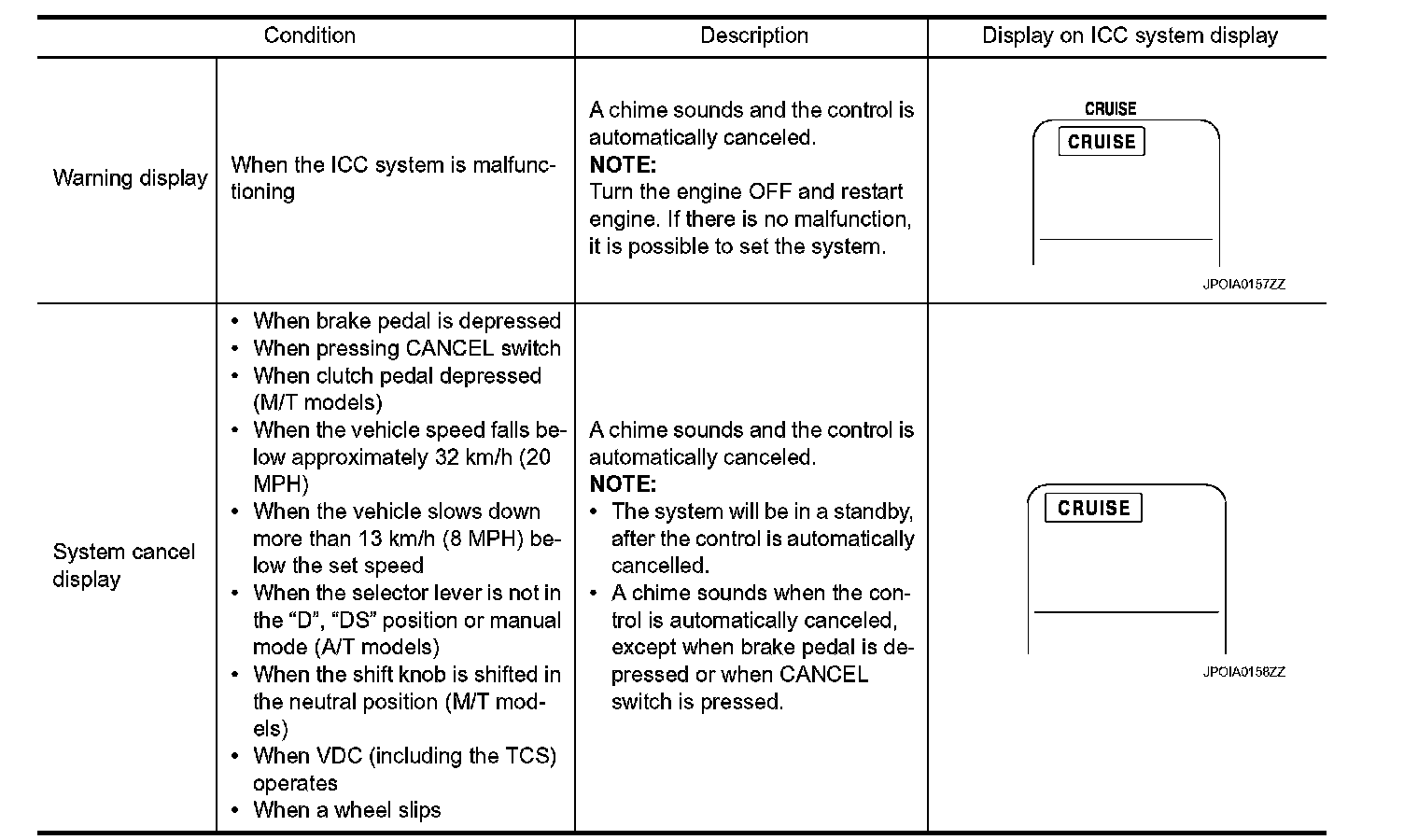 In the conventional (fixed speed) cruise control mode, a warning chime does not sound to warn driver if own vehicle are too close to the vehicle ahead, as neither the presence of the vehicle ahead nor the vehicle-to-vehicle distance is detected.