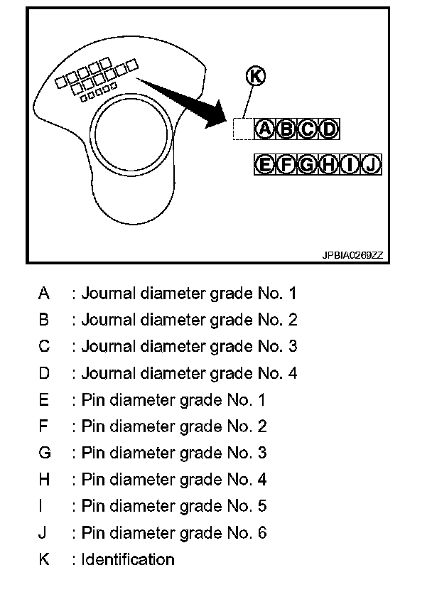 2. Apply crankshaft pin journal diameter grade stamped on crankshaft front side to the column in the "CONNECTING ROD