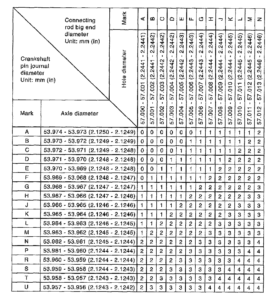 4. Apply the symbol obtained to the "CONNECTING ROD BEARING GRADE TABLE" to select connecting rod bearing.