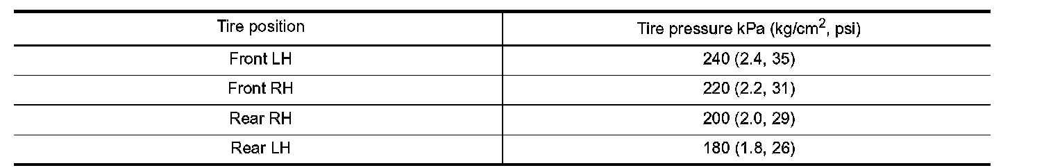1. Adjust the tire pressure for all wheels to match the list below.